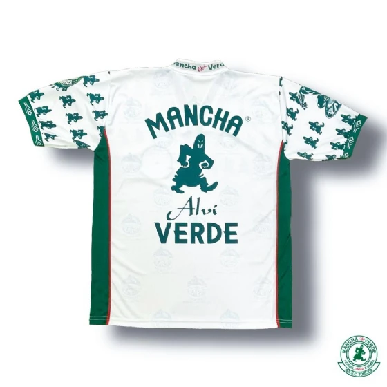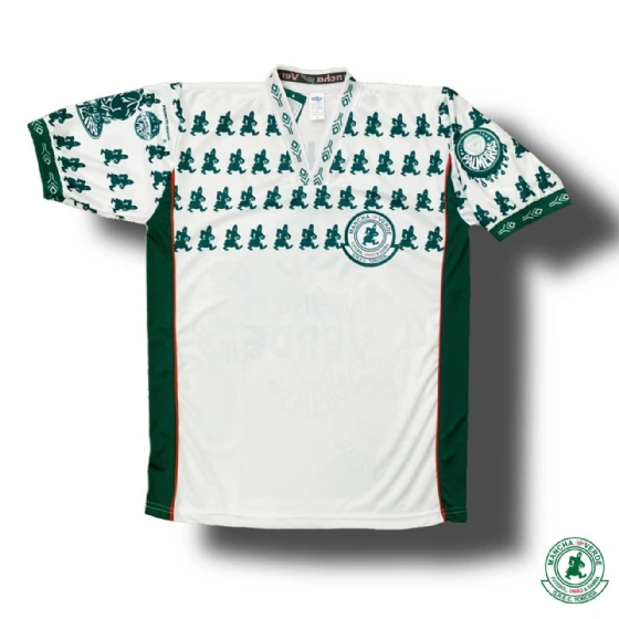 Detalhe: Gola em v escrito Mancha alvi verde, frente da camisa com o manchinhas e escudo da mancha no lado esquerdo do peito. Parte de trás logo Mancha alvi verde.